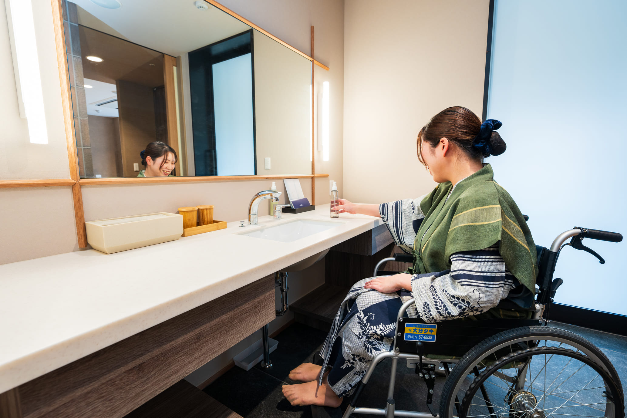 誰にとっても安心で快適な滞在を追求し、ユニバーサルデザイン客室「湯楽」が誕生。段差のない設計や広々とした動線は、車椅子をご利用の方やご高齢の方にも優しい客室です。さらに、客室内には源泉かけ流しの温泉風ください呂を完備。心と体を癒す極上の湯をプライベートな空間で、心ゆくまで別府の名湯をお楽しみください。