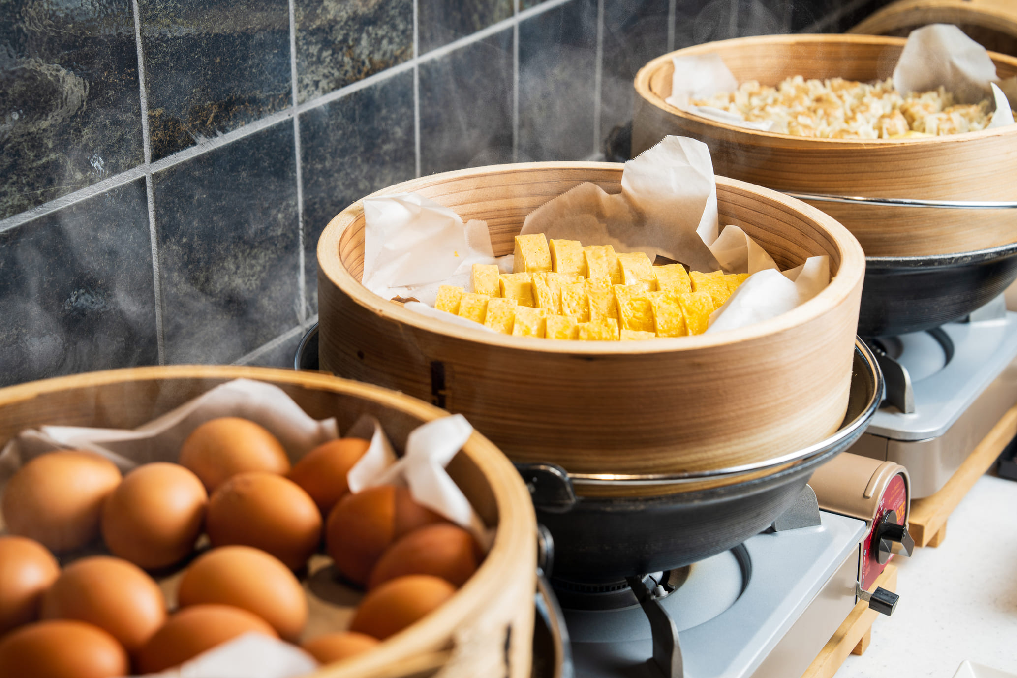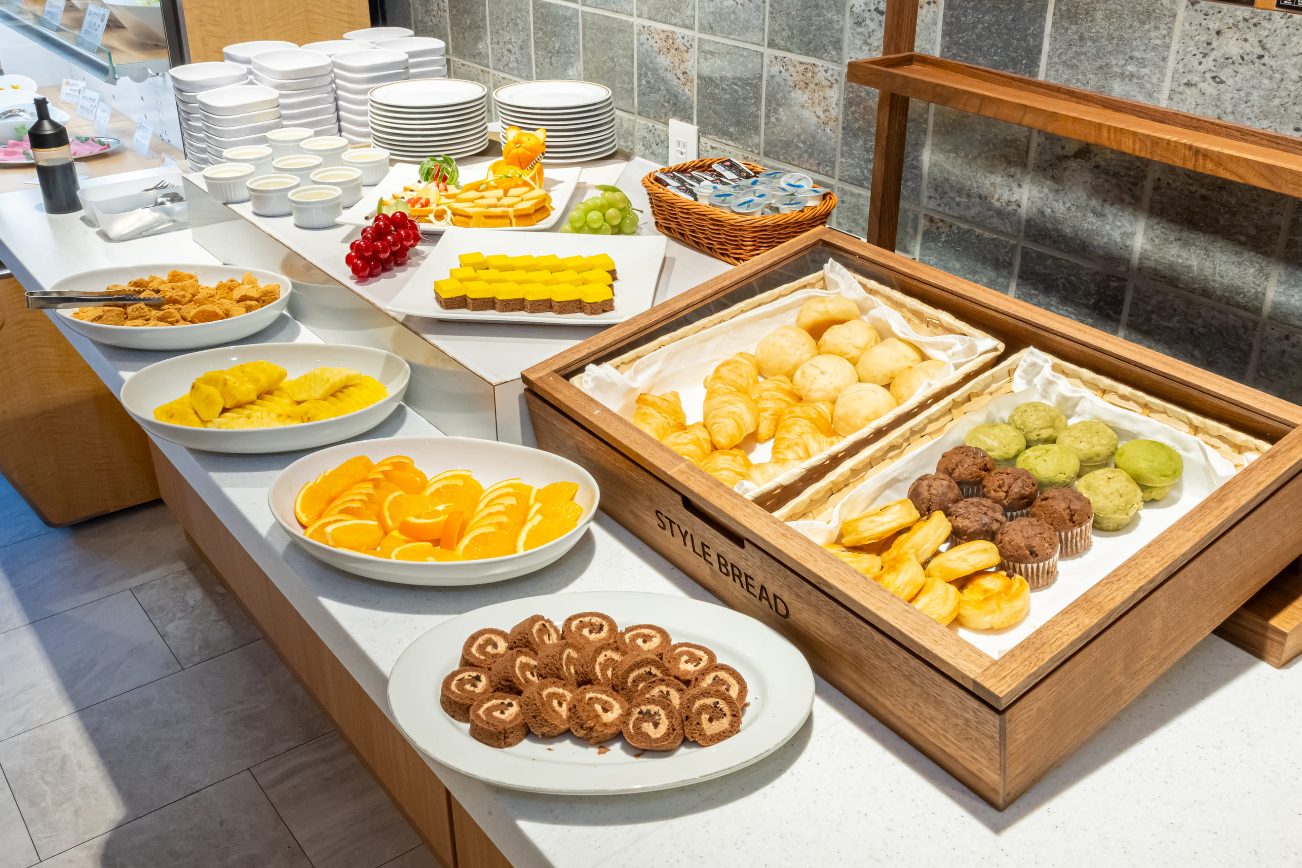 朝食は、大分の豊かな食材を活かした和洋折衷約50種類の料理が並ぶビュッフェスタイル。特に、地元大分県産のブランド米「山香米(やまがまい)」は、多くのお客様からご好評いただいています。ヘルシーな地獄蒸し料理や、お子様も喜ぶソフトクリームなど、わくわくするメニューが揃い、1日の始まりを元気にスタートできます。