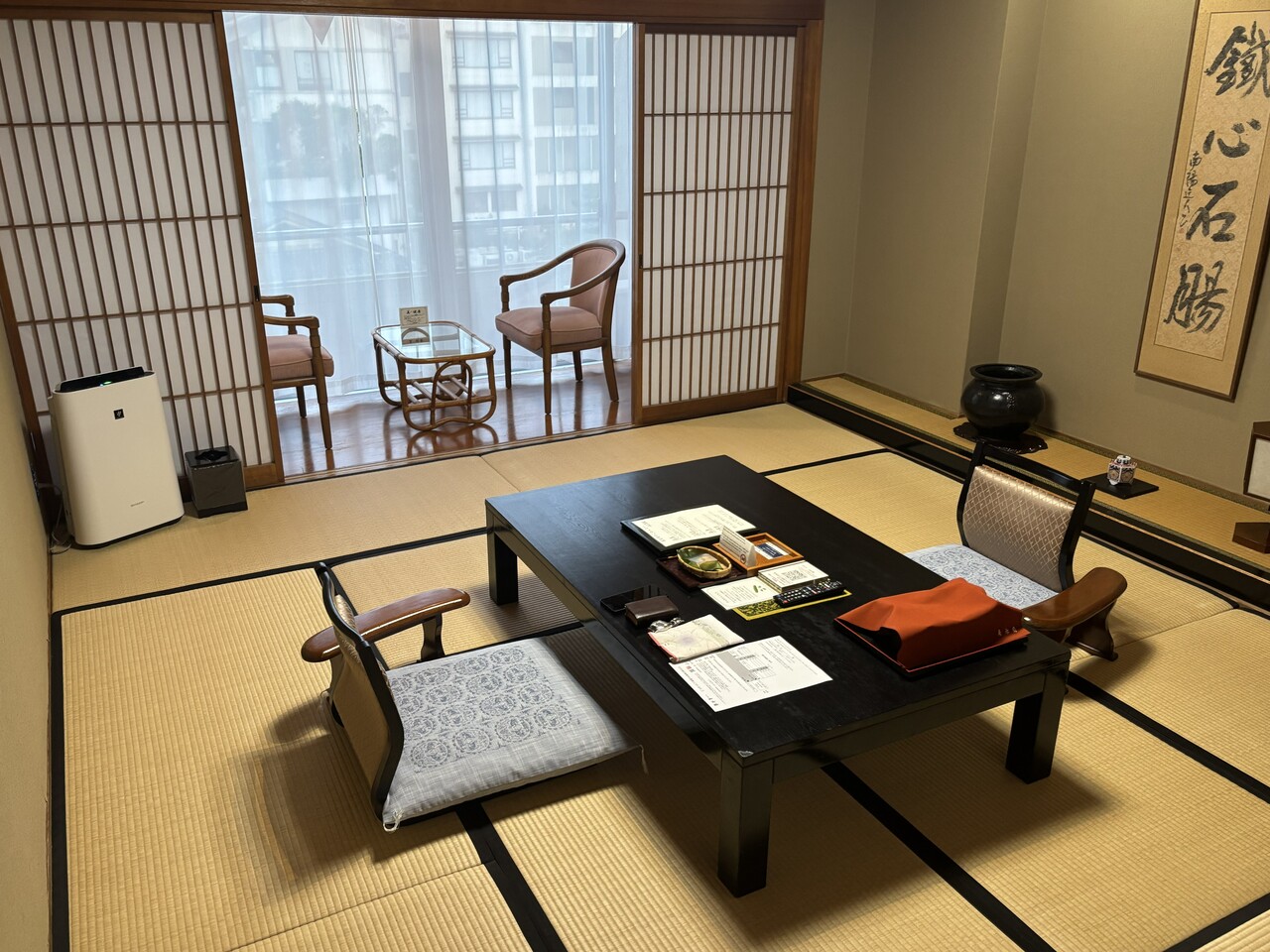 私は和室10畳のお部屋に宿泊させていただきました。お部屋には床の間などもあり和の雰囲気がたっぷりのお部屋でした!また、襖の取っ手などには陶器を使用しているなどの細かいこだわりもありました。