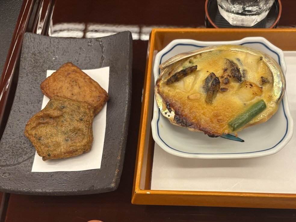 さつま揚げは、あおさとかつお節の2種類が楽しめます。私の宿泊した期間では、アワビの素味噌焼きがメインとして提供。初めて食べましたがアワビが柔らかくて美味しかったです!さつま揚げも香り豊かでとても美味しかったです!
