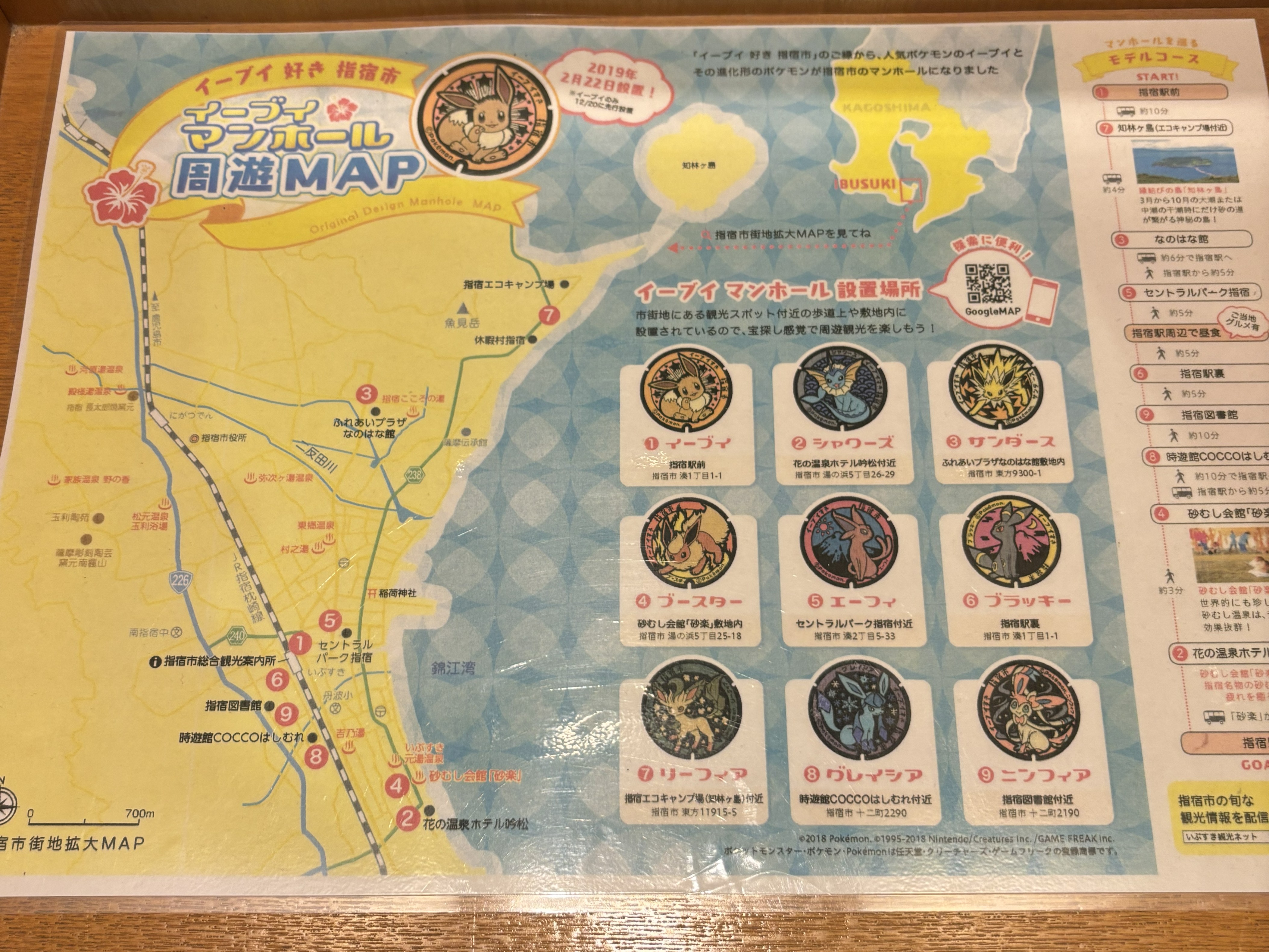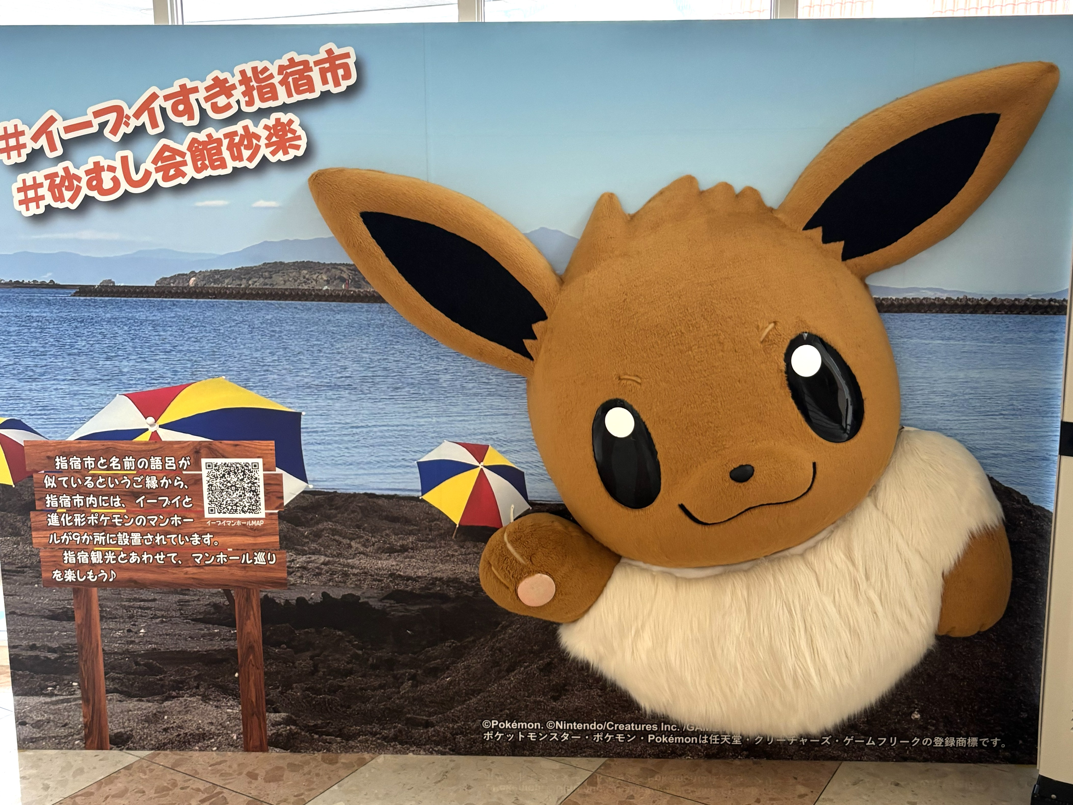 また、指宿市はイーブイとも出会える街です。いぶすき秀水園にもイーブイのマップがあり、翌日、マンホール探しをしてみました。全て写真に収めましたが、所要時間としては2時間から3時間ほど。かなり見つけにくい場所もあるので、根気が必要です。街の様々なところにいるイーブイを探してみるのも旅の思い出になるのではないでしょうか?