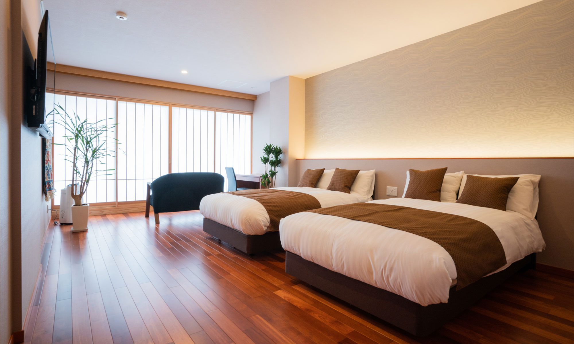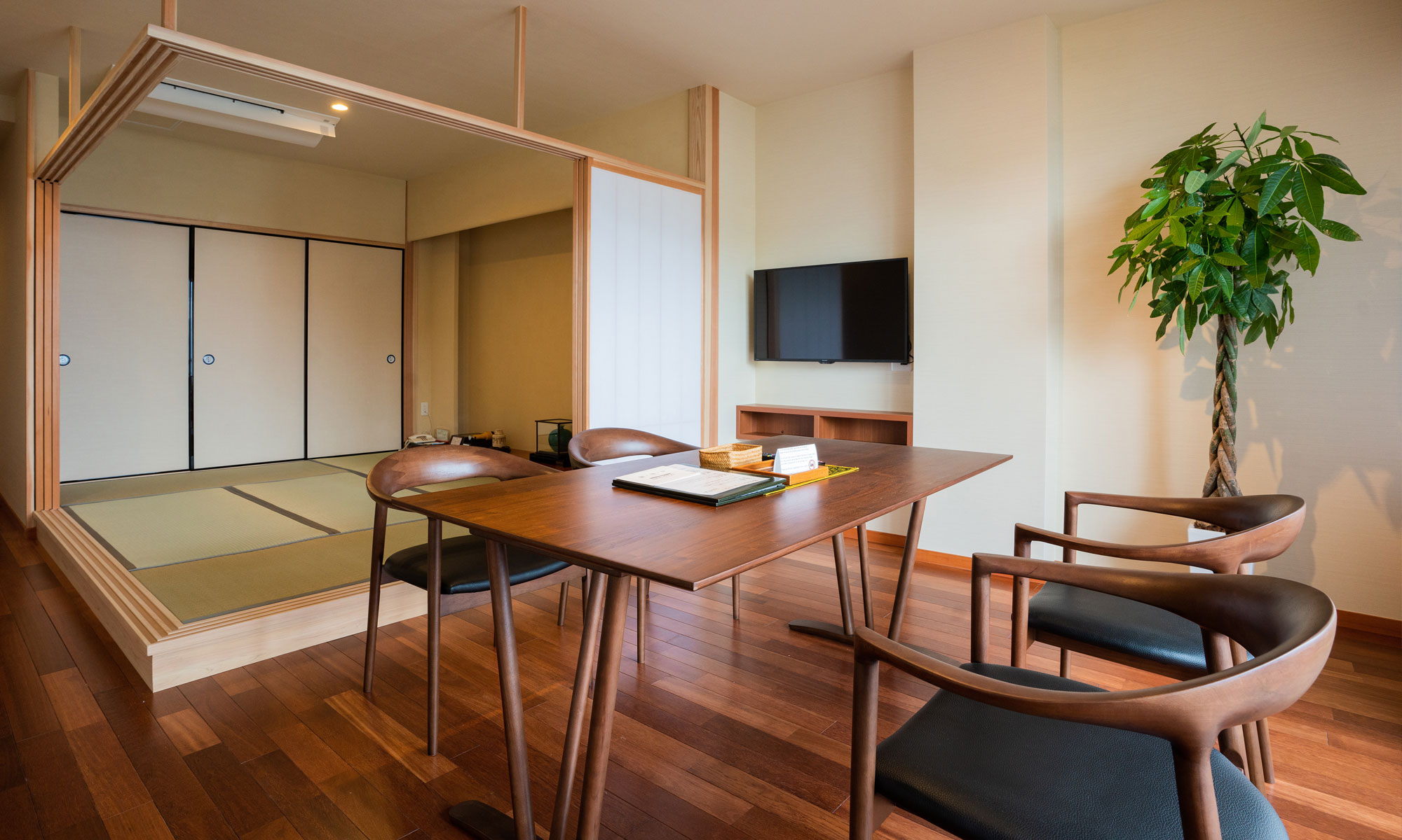 お部屋は和のぬくもりが感じられる10畳の部屋から、ご家族やグループにぴったりな二間、畳の落ち着きとベッドの寝心地の両方が楽しめる和洋室など、お客様のニーズに合わせた幅広い部屋タイプがそろいます。ふすまの引手には有田焼が使われており「秀水園」の文字が。ゆっくりとくつろぎながらも隅々にこだわりを感じられるそんなお部屋ばかりです。