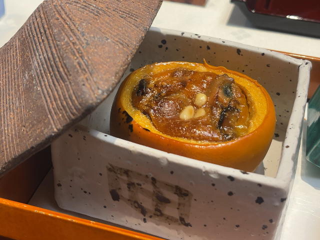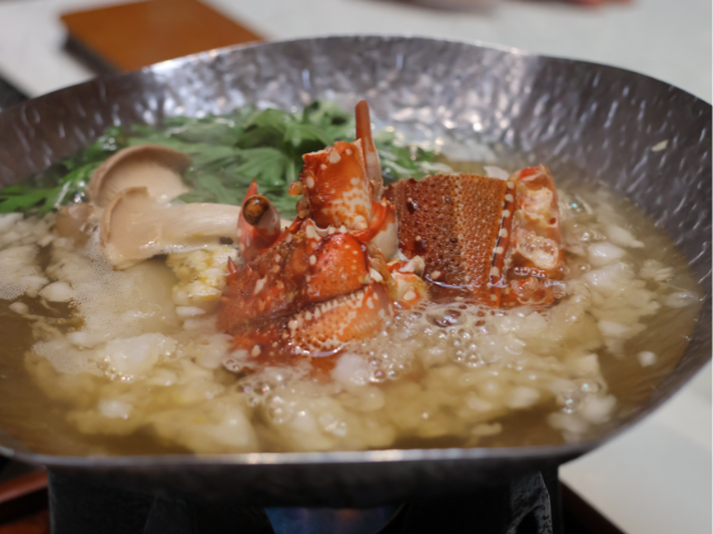 お料理は鹿児島県内で採れた新鮮な食材が中心。下ごしらえから手間を惜しまずに、料理長の真心こもった想いと丁寧な手仕事がつまった料理が並びます。おすすめは素材の味を生かし、四季折々の味わいを楽しむ季節の会席。「柿釜ふろふき焼き」は11月~12月頃の期間限定ですが、変わらぬ味にファンも多い一品です。実は、伊勢海老は秋に旬を迎える指宿の食材。プリプリの身に濃厚な伊勢海老は絶品でした。春になると桜鯛が旬を迎え四季折々の食材が堪能できるのも指宿の魅力です。宿泊する季節によって違う“おいしさ”に出会えるのも楽しみのひとつだと感じました。