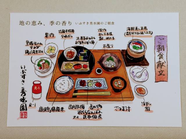 朝食で印象的だったのが最高級といわれる指宿本枯節のかつお節。削りたてで驚くほど香りがよく、お醤油を垂らして九州産のお米と一緒にいただくとその相性は抜群!郷土料理や彩の良いおかずが並び、五感で楽しめる朝食は一日の始まりにぴったりでした。さらにスタッフお手製のイラスト入りの献立表が添えられ、裏面は思い出にとして持ち帰られるようにポストカードになっています。