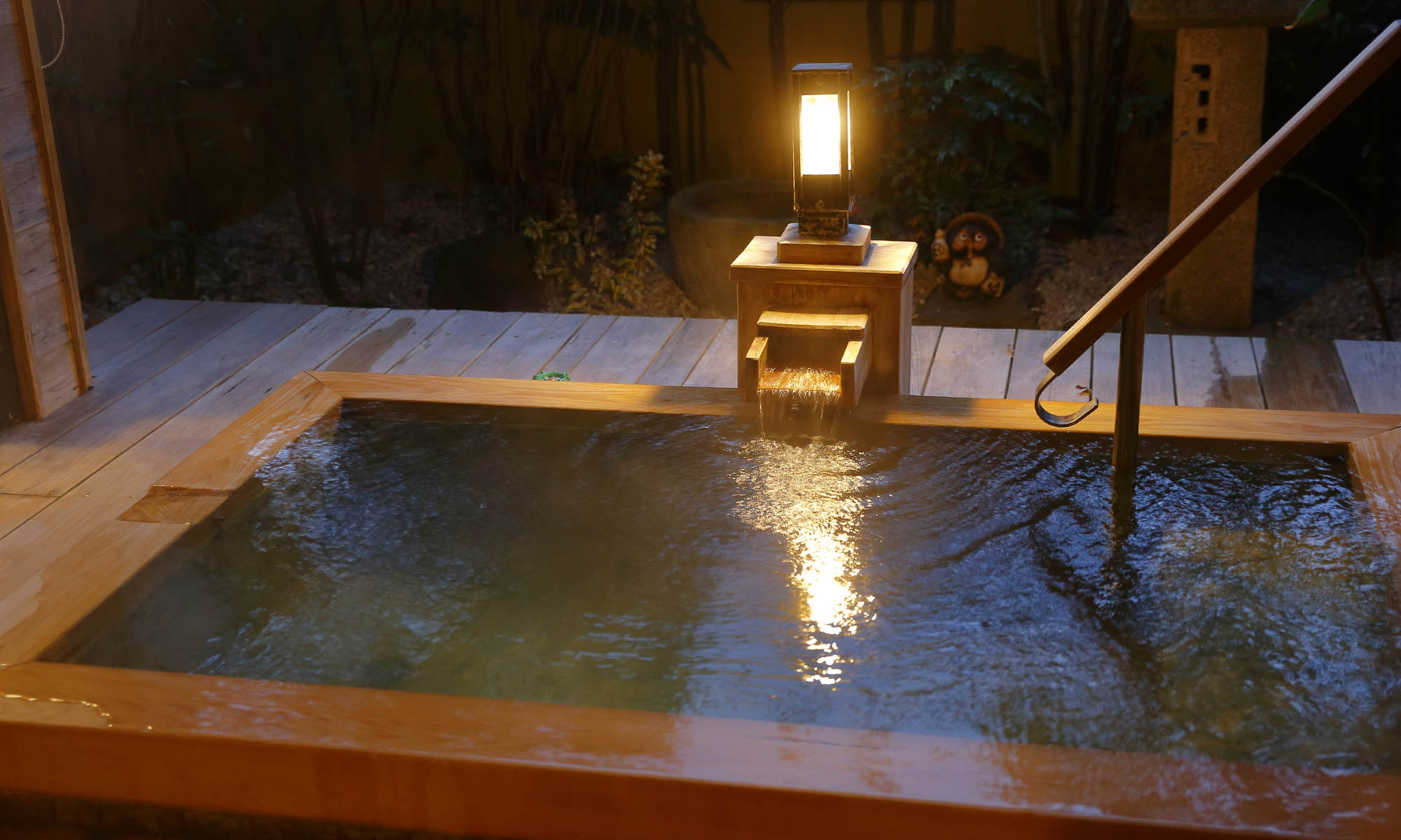 貸し切り風呂は、周りを気にせず入れるプライベート感たっぷりの特別な空間。専用のリビングが付いていて、桧風呂と石風呂の2種類から選べます。昼間と夜でも雰囲気が変わるのも魅力の一つ。自分のペースでのんびりと温泉時間を楽しめます。バリアフリー設計になっているため、どなたでも安心してご利用いただけます。(到着後の予約受付・有料)