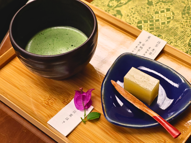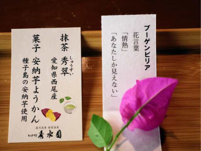 ウェルカムドリンクは、抹茶とスパークリングワインから選択が可能。(団体のお客様はお部屋にて抹茶の提供となります)季節のスイーツとお花を添えたおもてなしが、いぶすき秀水園らしい心づかいを感じます。