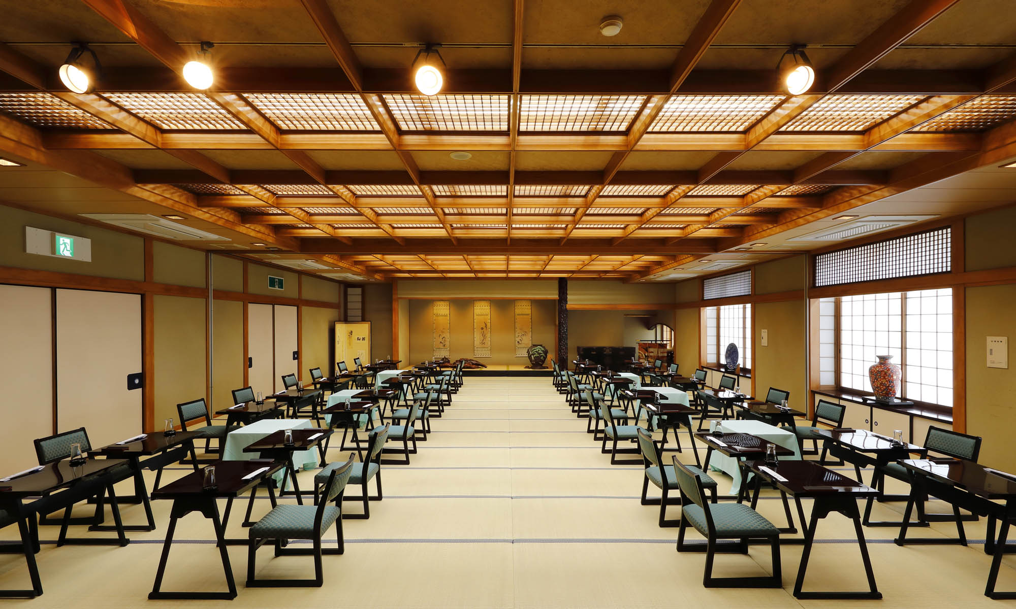 近年、団体を受け入れる旅館が少なくなる中ですが、いぶすき秀水園では35名ほどが利用できる宴会場があります。大人数で特別な時間が過ごせるのが宴会場の醍醐味。90畳の和宴会で記念旅行やグループ旅行、会社行事などにご利用いただけます。(※カラオケは不可、テーブルでのスタイルが基本となります)