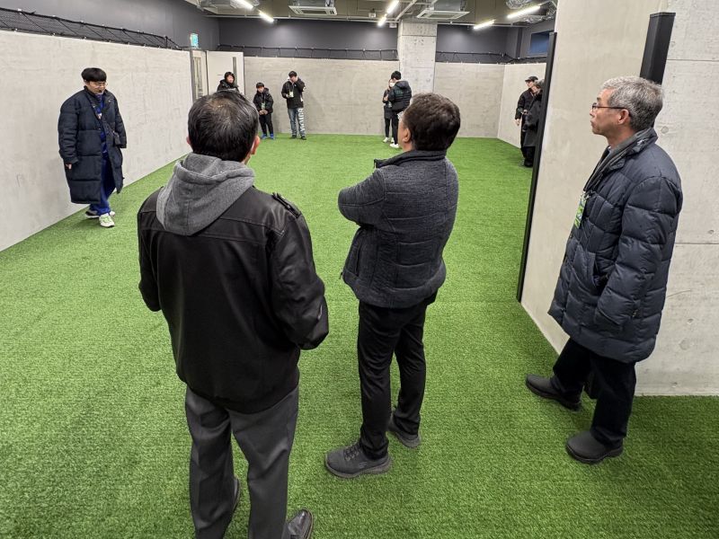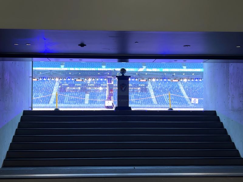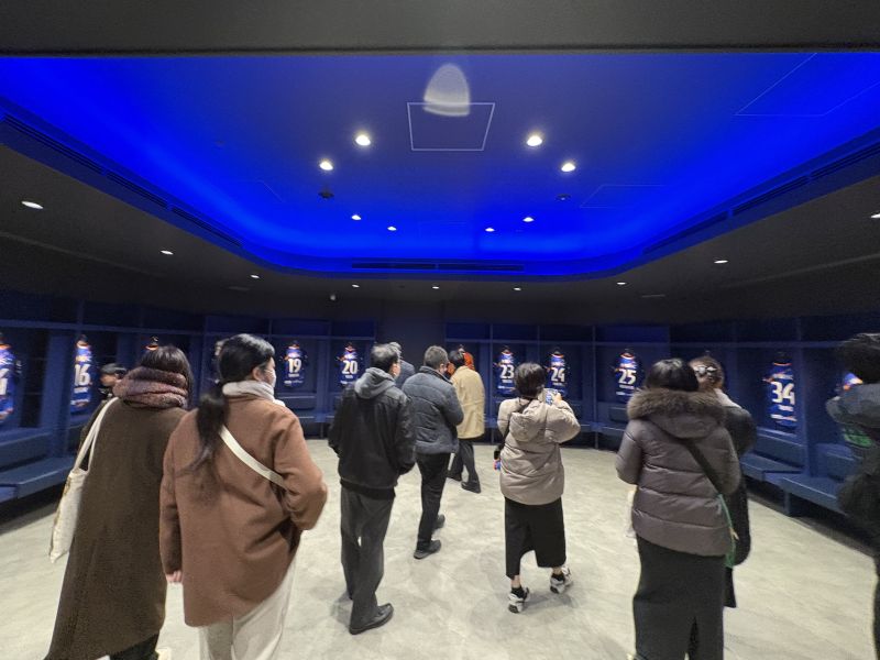 スタジアムを客席から見た後は、いよいよ裏側へ潜入!選手のウォームアップエリアや更衣室などを見学ができます。更衣室はチームカラーのブルーのライトで照らされ、円を描くように並ぶ選手のユニホームが印象的です。