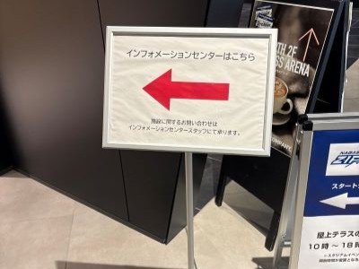 当日、降車場所でのスタッフのお出迎えはないので、添乗員さんの引率、もしくはお客様ご自身で、まずはインフォメーションセンターへ。STADIUM CITY NORTH(乗降場所北側の建物)内のエスカレーターで2階へ上がり、右手側へ進みます。少し入りこんでますが、案内があるので安心です。受付開始はツアー開始時間の10分前。手続きを行いパスを受け取ります。(このパスはツアー終了後、記念として持ち帰ることができます。)。